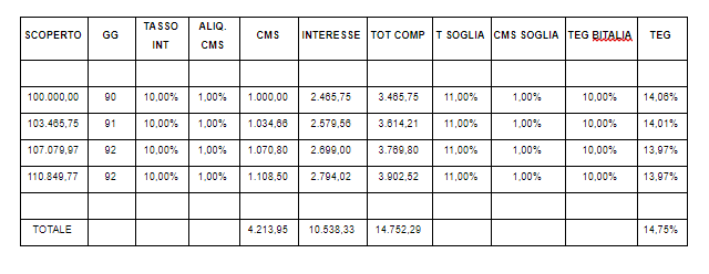 Simuliamo un utilizzato di 100.000 euro ad un tasso del 10% e ad una commissione di massimo scoperto del 1%, come espresso nella tabella sotto riportata.