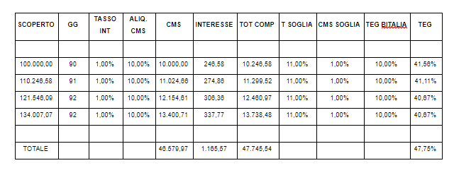 Il correntista a fine anno spenderebbe 47.745,54 euro, vale a dire un TEG del 47,75% ma, secondo la circolare Banca d'Italia del 2 dicembre 2005 si avrebbe in ogni caso un TEG del 10%.