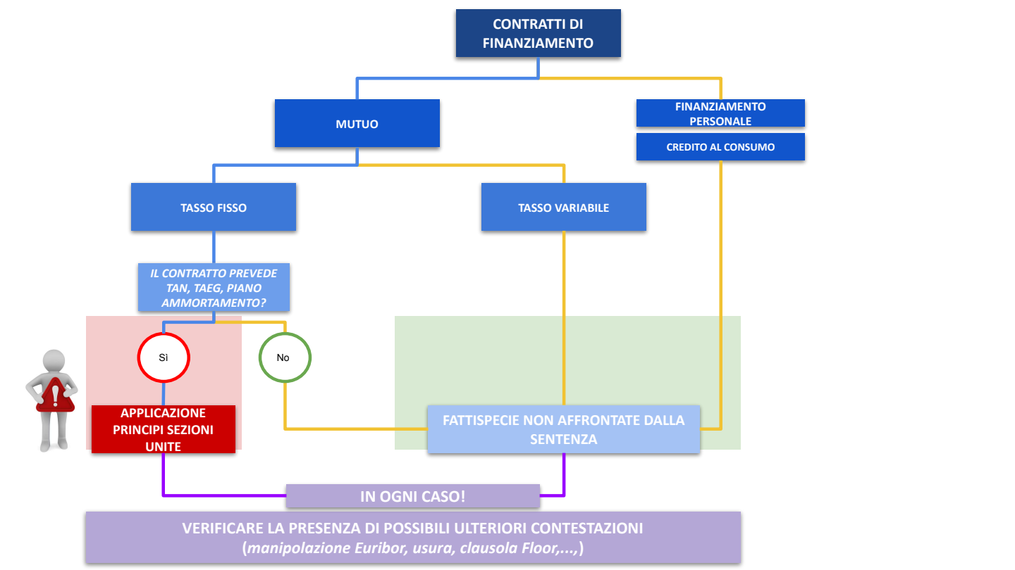 Per facilitare la comprensione dell’ambito applicativo della sentenza proponiamo di seguito un sintetico schema, attraverso il quale comprendere entro quali margini sia possibile procedere a sistematiche contestazioni nei riguardi dei singoli contratti di finanziamento in regime composto degli interessi.